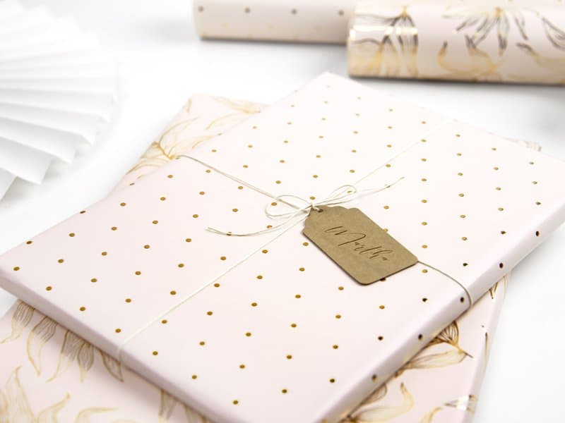 Balicí papír, růžový se zlatým metalickým vzorem - listy a tečky, mix, výška 70 cm, délka 200 cm, 2 ks.