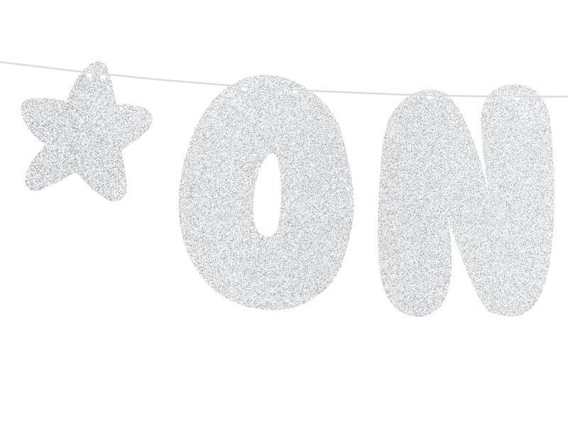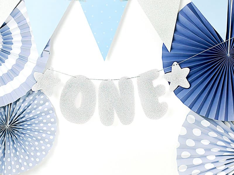 Baner - 1. narozeniny, 1 ks, vyrobený ze stříbrno-třpytivého papíru, udělej si sám, sada obsahuje písmena, 2 hvězdičky a cca 2 m vlasce. Velikost po sestavení: výška cca 11,5 cm, délka cca 50 cm.