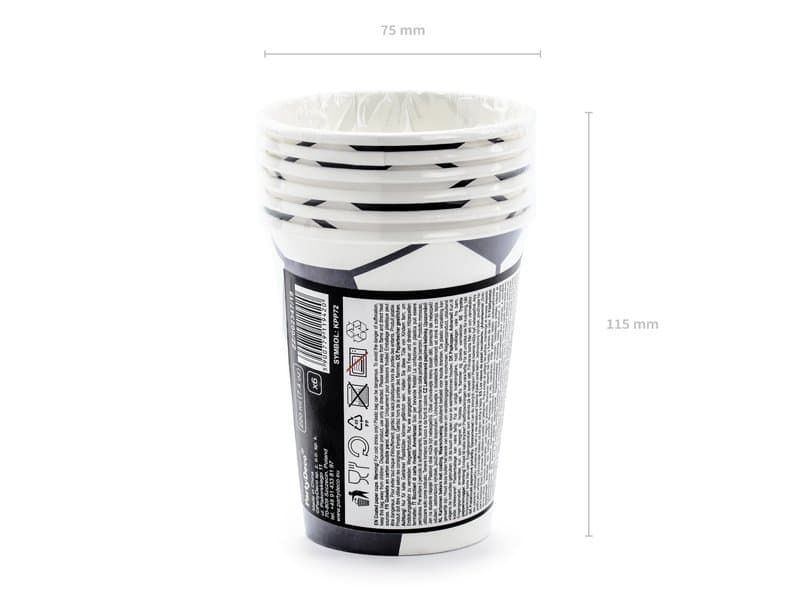 Papírové kelímky, fotbalové, z matného papíru s lesklým černým potiskem, objem 220 ml, 6 ks v balení.
