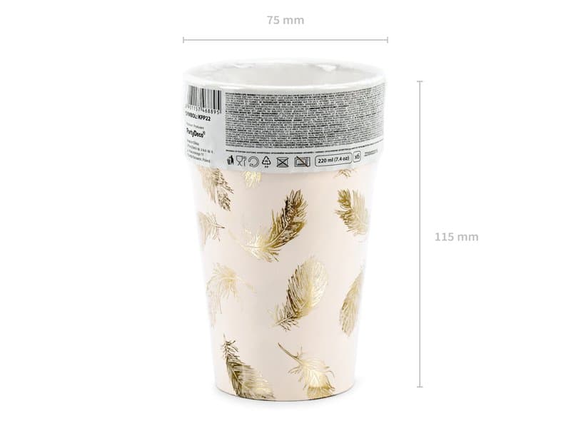 Papírový kelímek krásná labuť vyrobené ze světle růžového papíru se vzorem zlatého peří, objem 220 ml, 6 ks.